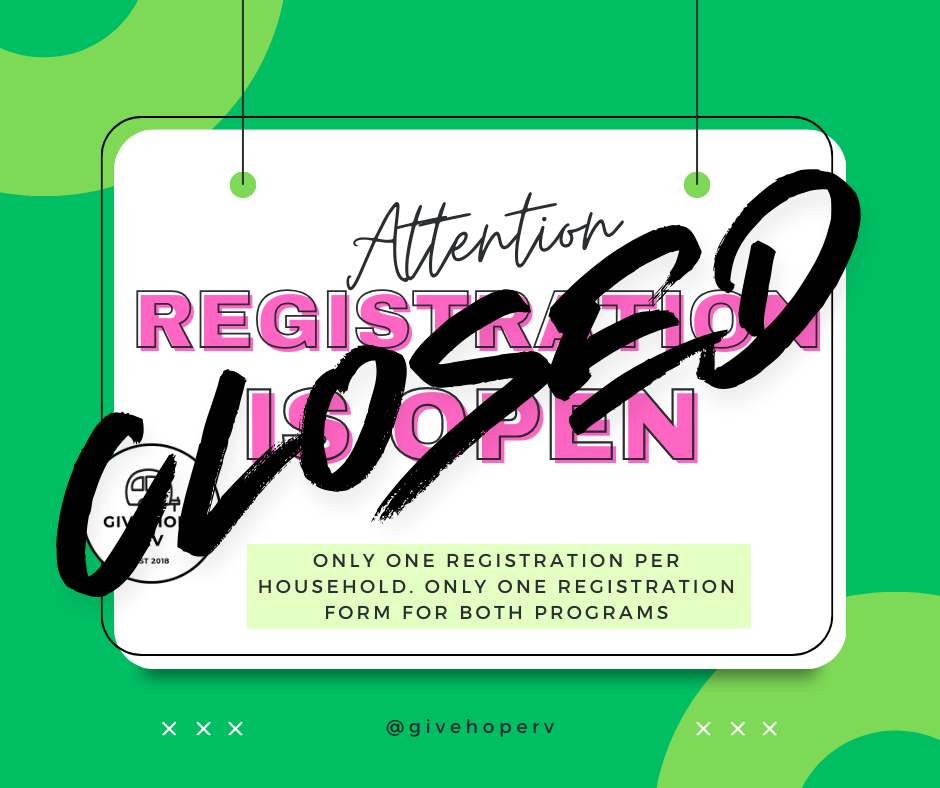 Please note: Give Hope Ministries does not provide camping units. Families must supply or have access to their own RV, pop-up camper, or tent.